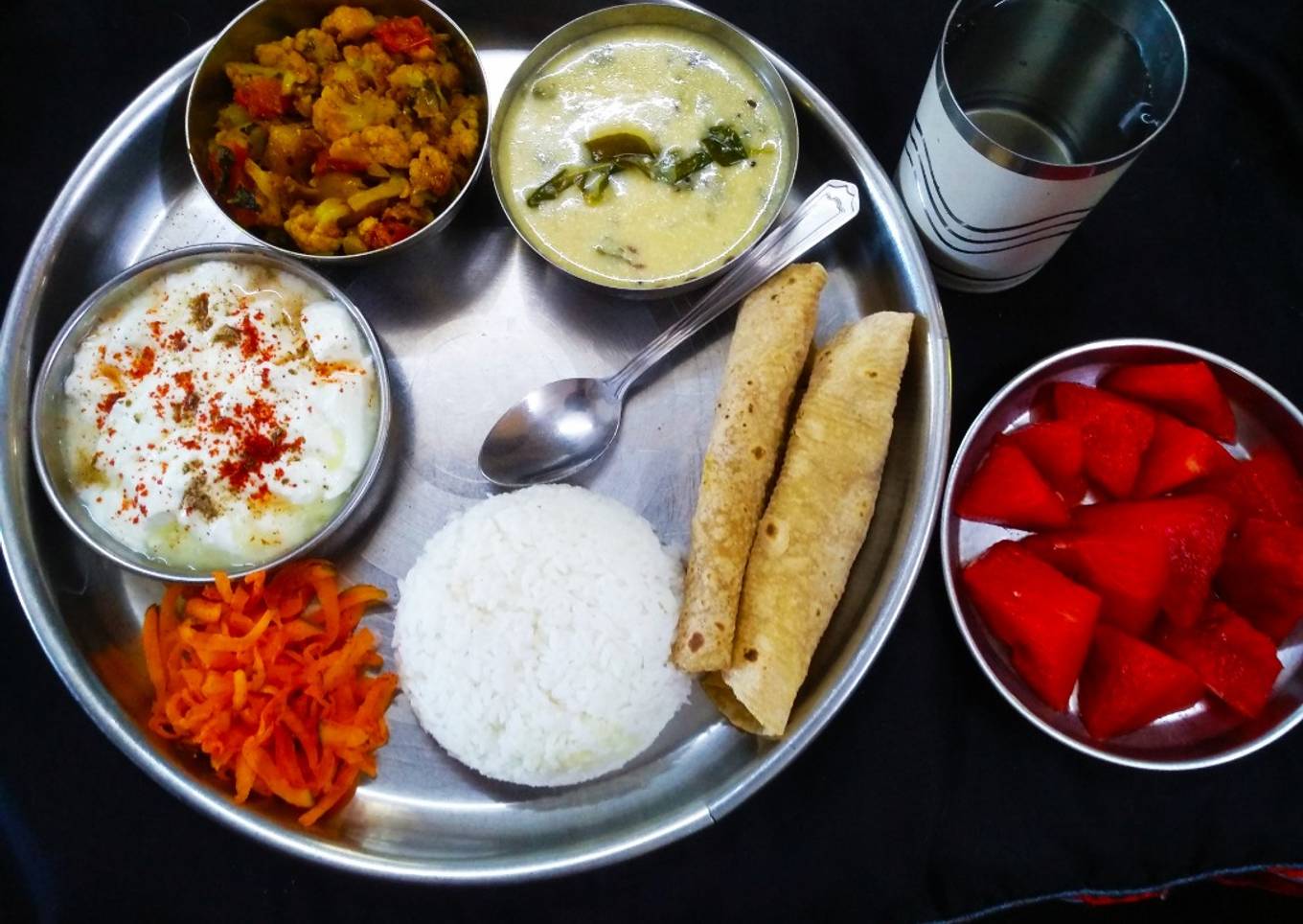 - Now take Thali and serve subji roti raita rice kadi salad and watermelon. Yummy Tasty Vegetables. Thali is ready to serve.