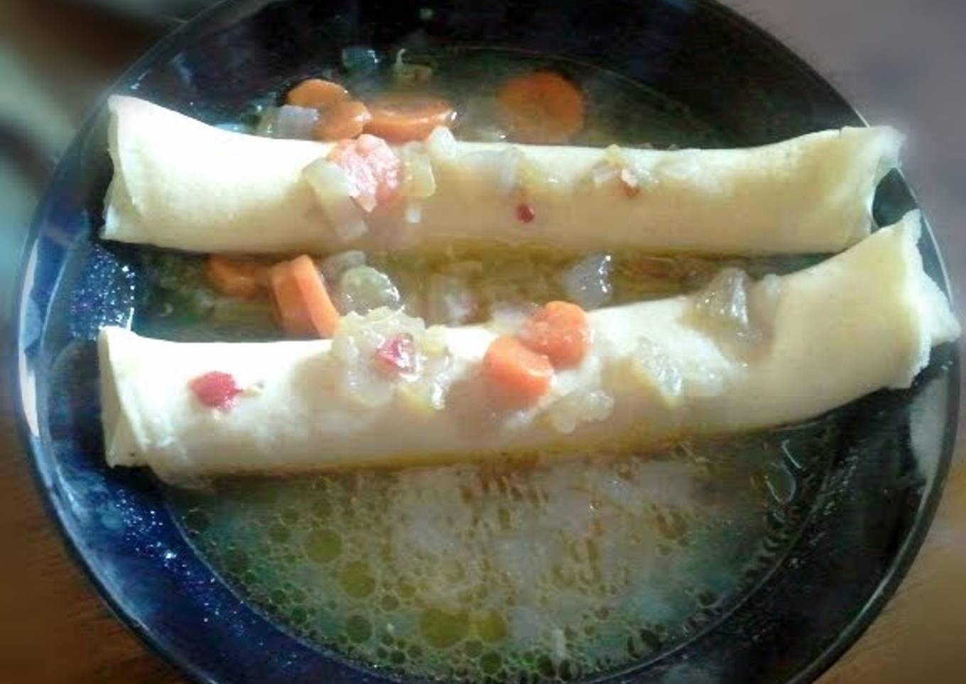 - Once you have made two pancakes per person, prepare bowls and remove chicken quarters and some of the larger vegetables from the stock and put to one side (this is great with fresh bread and butter for seconds or for another day). In each pancake sprinkle a small pinch of black pepper and an even layer of grated parmesan (you can use peccorino it's just as nice) and roll up and place into the bowls. Once all the pancake rolls are in, pour the broth over them untill they are submerged.