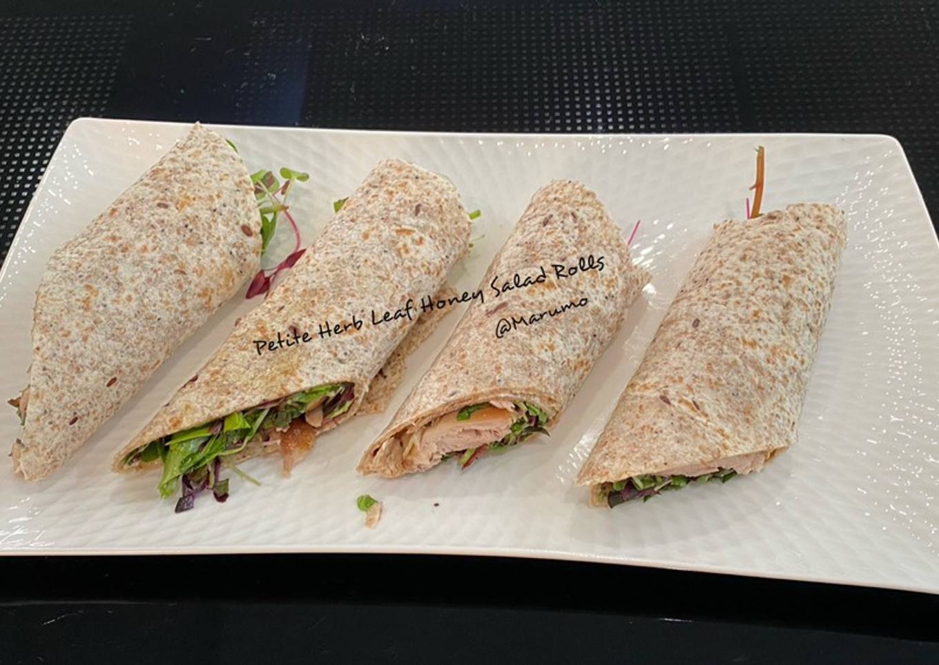 - Put the tortilla to sear on the hot pan to make it warm. Place it on the chopped cutting board, put Petite Herb Leaf and chicken on. Spread over the honey salad dressing. Roll and cut it. Ready to enjoy.