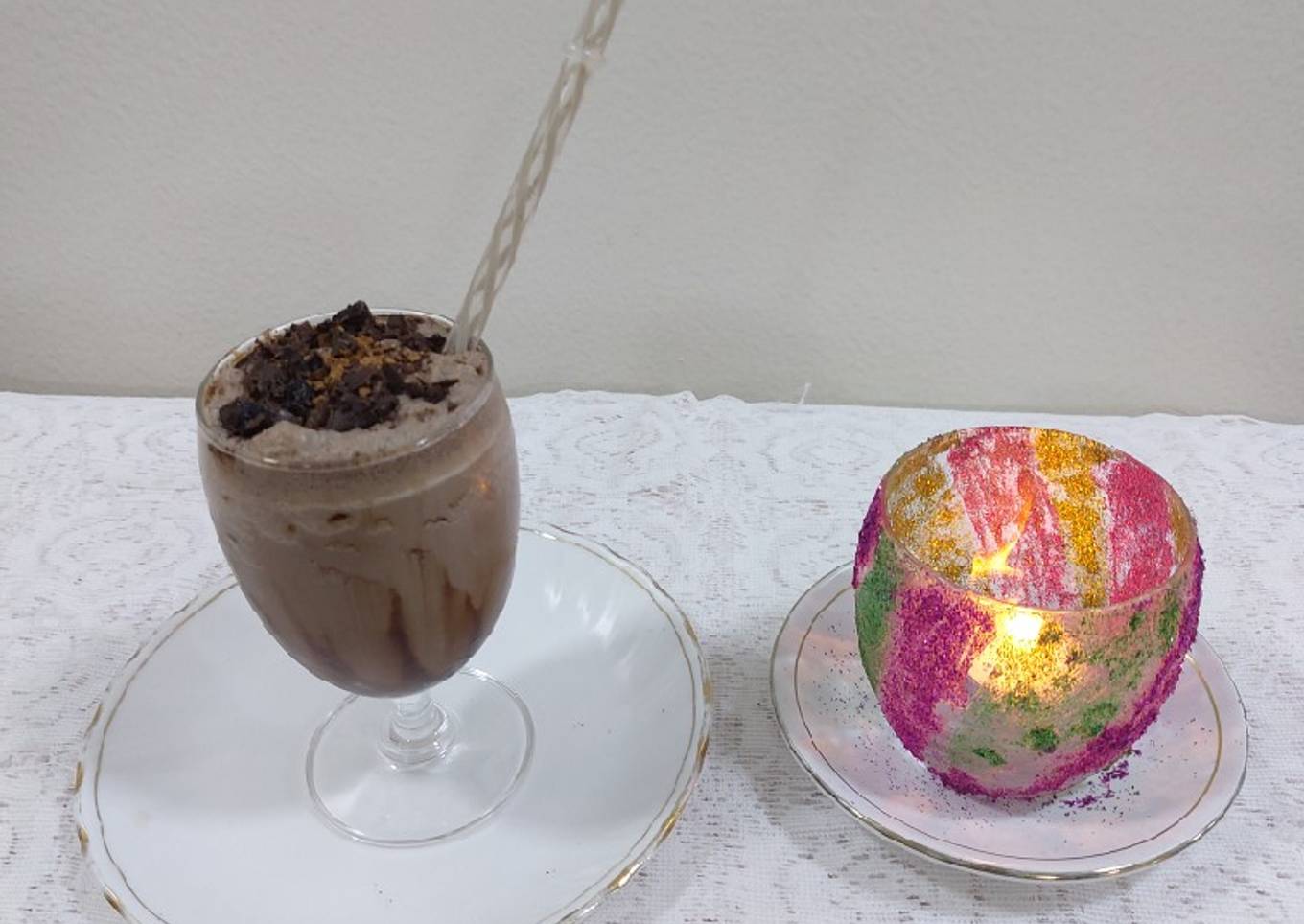 - Take a glass decorate chocolate syrup and pour into glass chocolate coffee and garnish chocolate pieces and cocoa powder